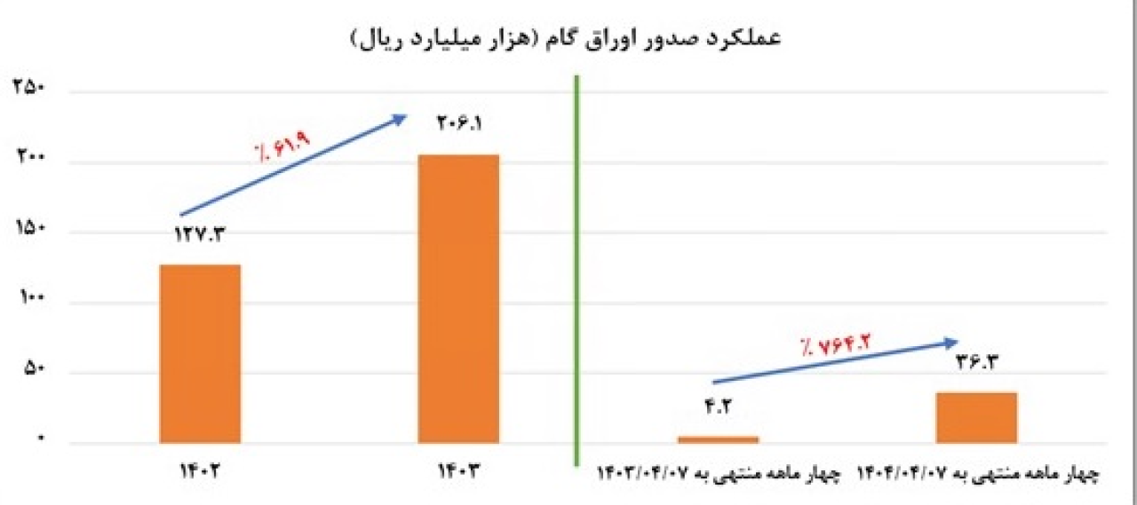 مدیر اداره تامین مالی زنجیره تولید بانک مرکزی اعلام کرد: طی سال گذشته 206.1 هزار میلیارد ریال اوراق گام صادر شد که نبست به سال ۱۴۰۲ حدود 61.9 درصد افزایش نشان می دهد. همچنین از ابتدای سالجاری تاکنون 36.3 هزار میلیارد ریال اوراق گام به منظور تامین مالی واحدهای تولیدی صادر شده است که در مقایسه با عملکرد مدت مشابه سال گذشته (۴.۲ هزار میلیارد ریال) رشد چشمگیری داشته است.